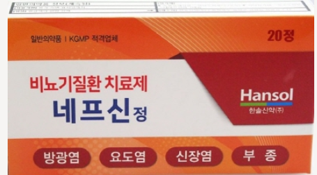 | 네프신정 | 황금, 황백, 감초 등 | 이뇨작용, 염증 완화 | 1일 3회, 1회 3정 |